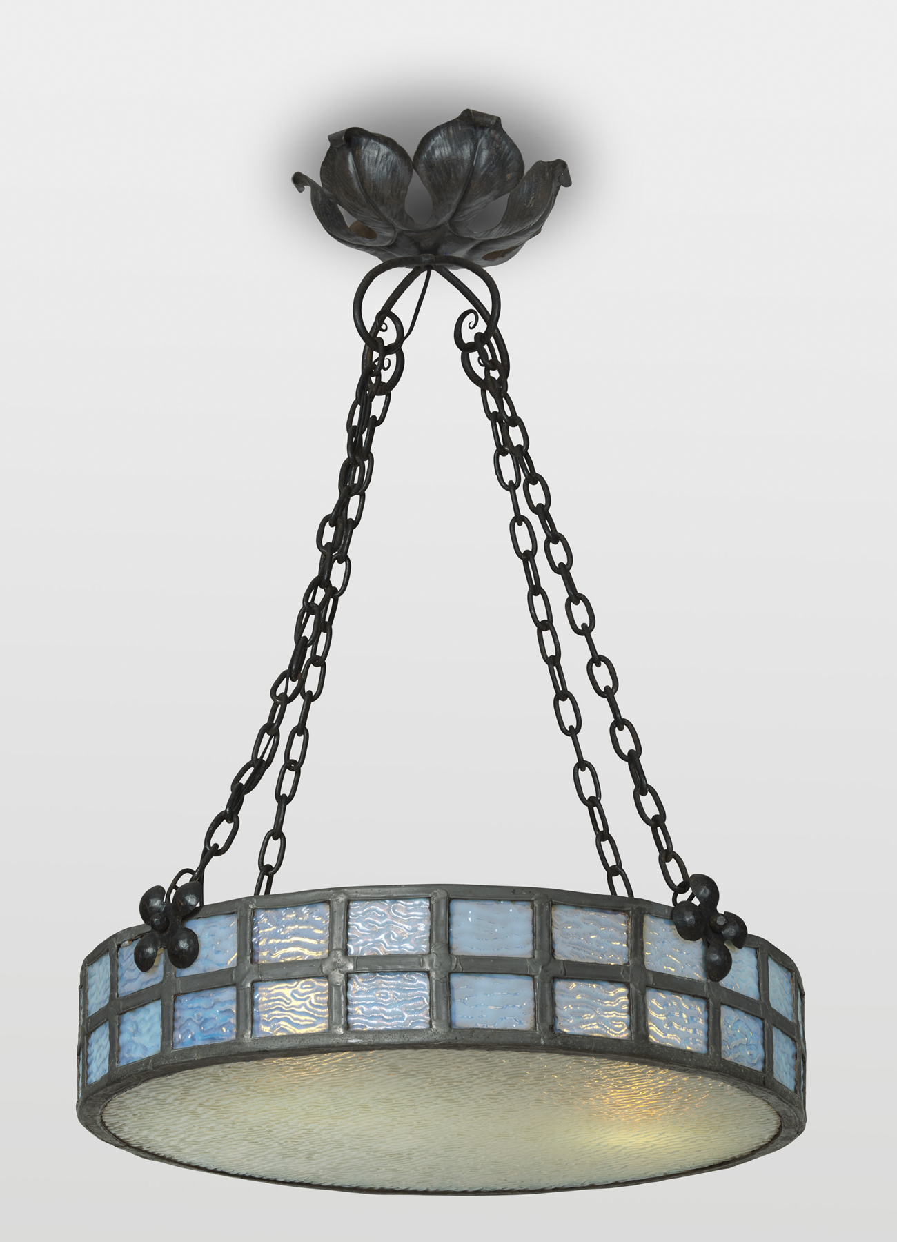 En fer forgé à décor de végétaux et verre bleu