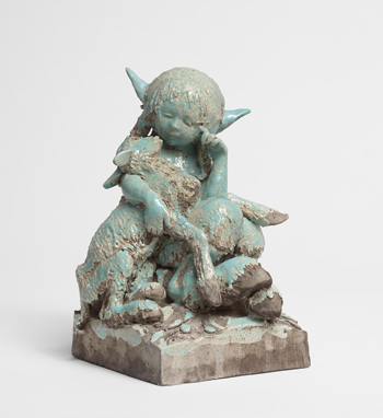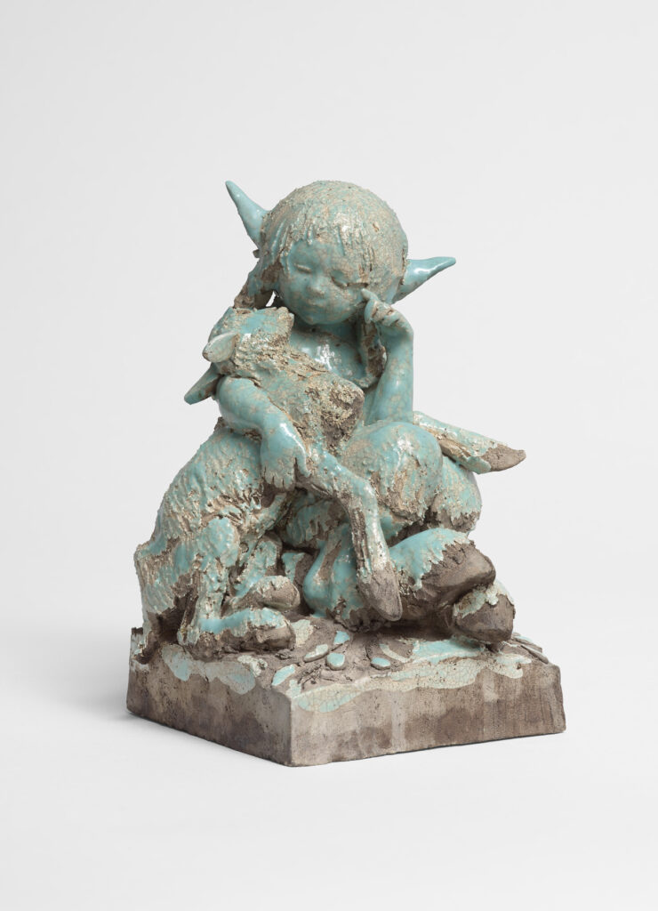 Sculpture en terre chamottée à engobe gris et émail turquoise