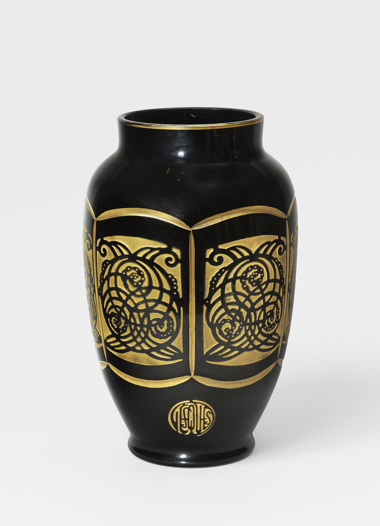 En verre opalin noir à motif floraux stylisés gravés et dorés,