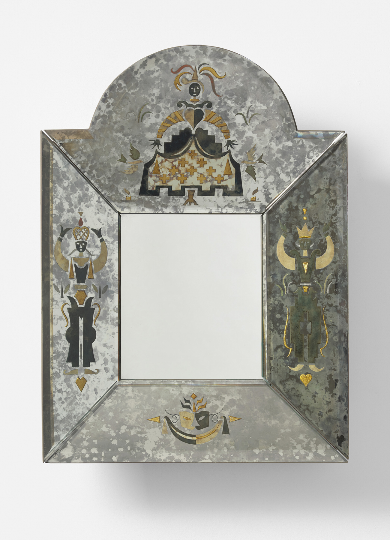 En panneaux de miroirs églomisés à décor doré d’une reine, deux troubadours et un masque de théâtre