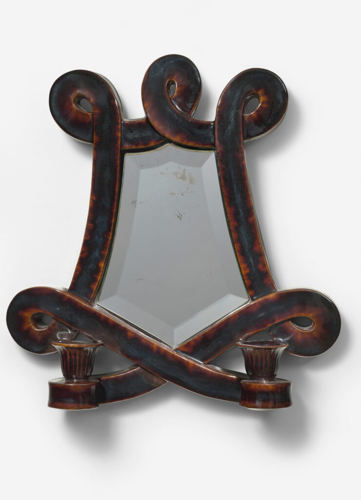 En céramique émaillée brune à décor de volutes et à deux bras de lumière,