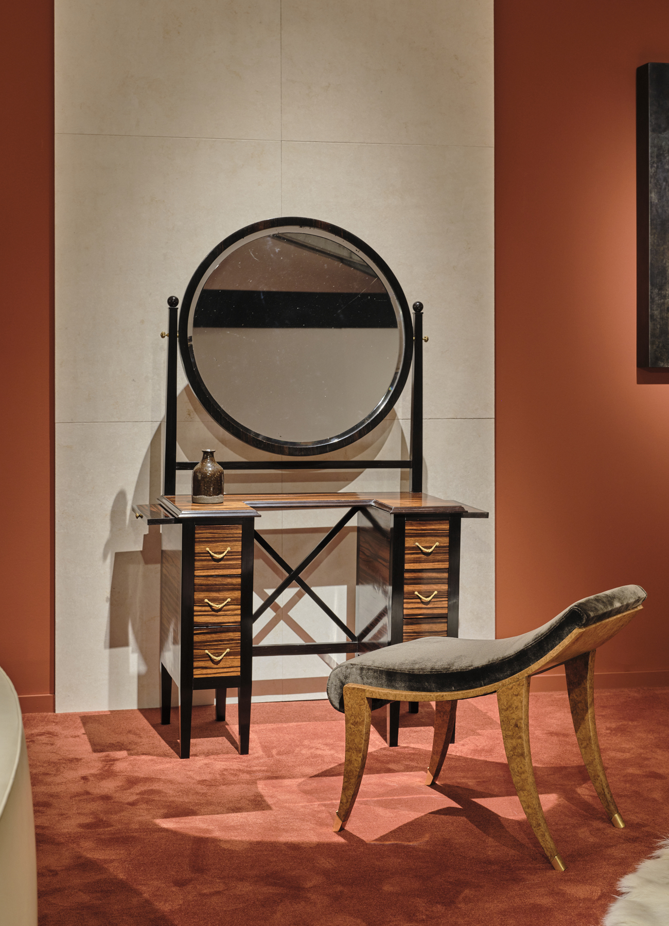 Dressing table chair in burled amboyna, bronze sabots
