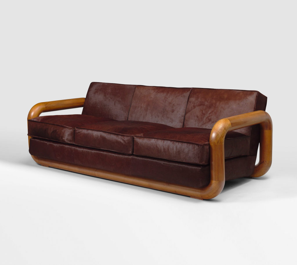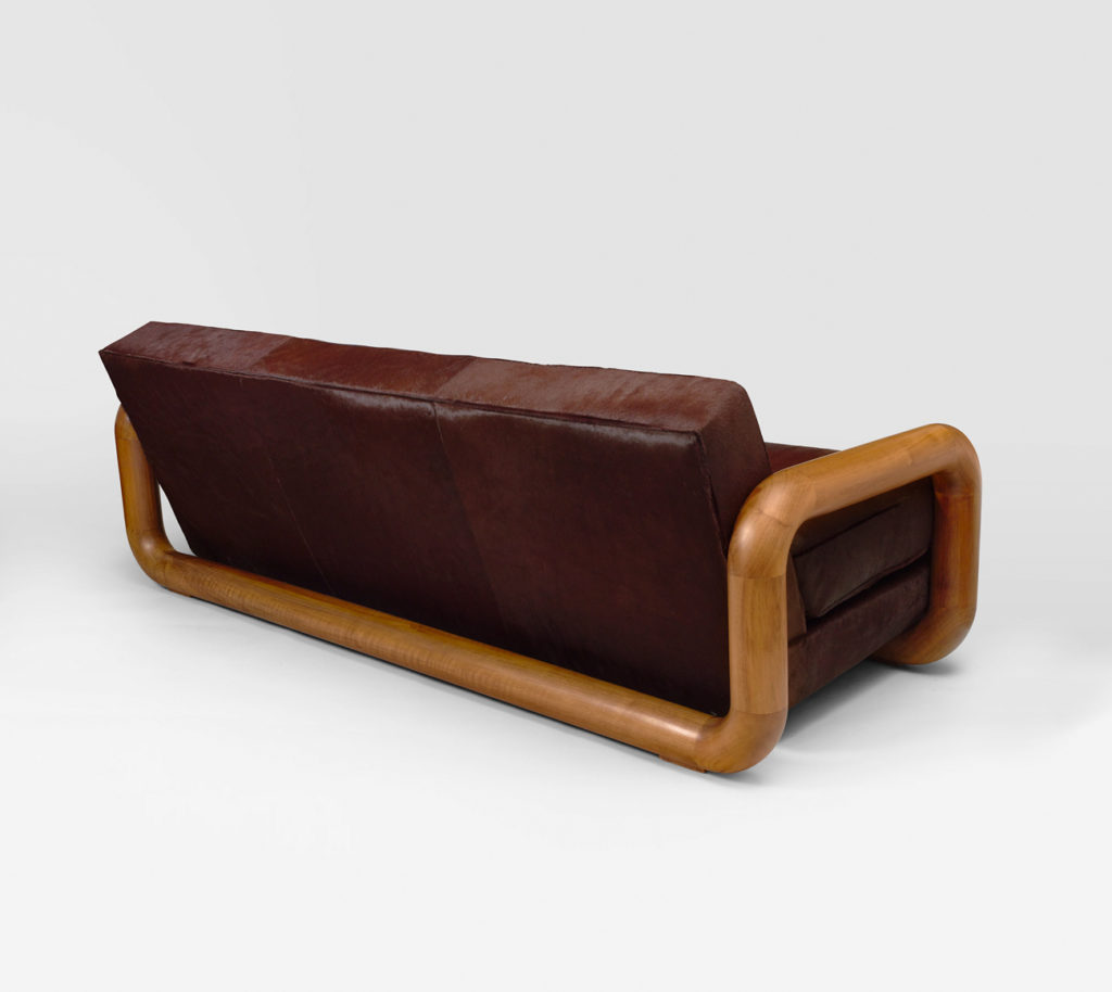 Thick tubular structure “in harness” in walnut and upholstered with cowhides