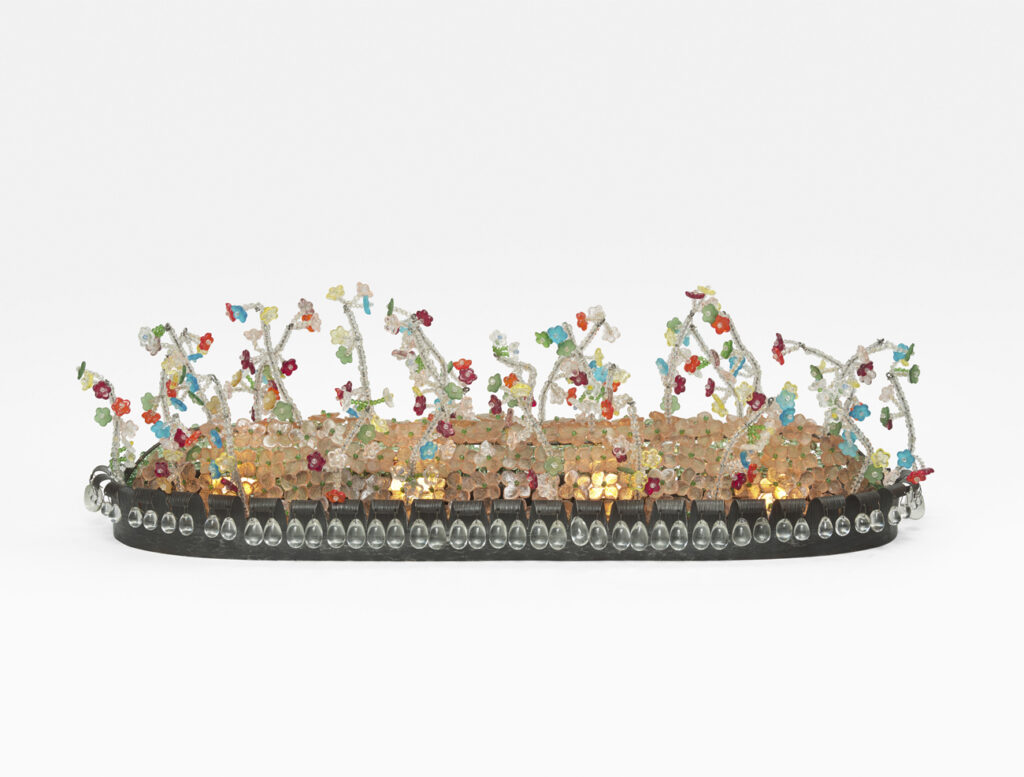 En fer forgé, verroterie de couleurs et perles de cristal formant un bouquet de fleurs