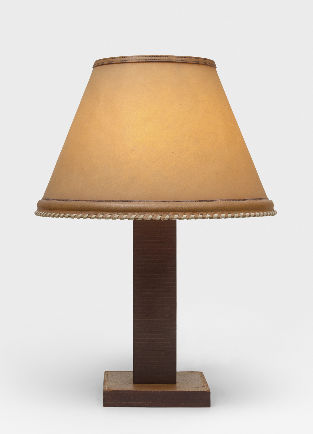 Gainée de cuir piqué sellier sur une base quadrangulaire, abat-jour conique en papier avec bordure en cuir Havane cousu large, estampillée « Hermès Paris 24 Fb St Honoré » sous la base